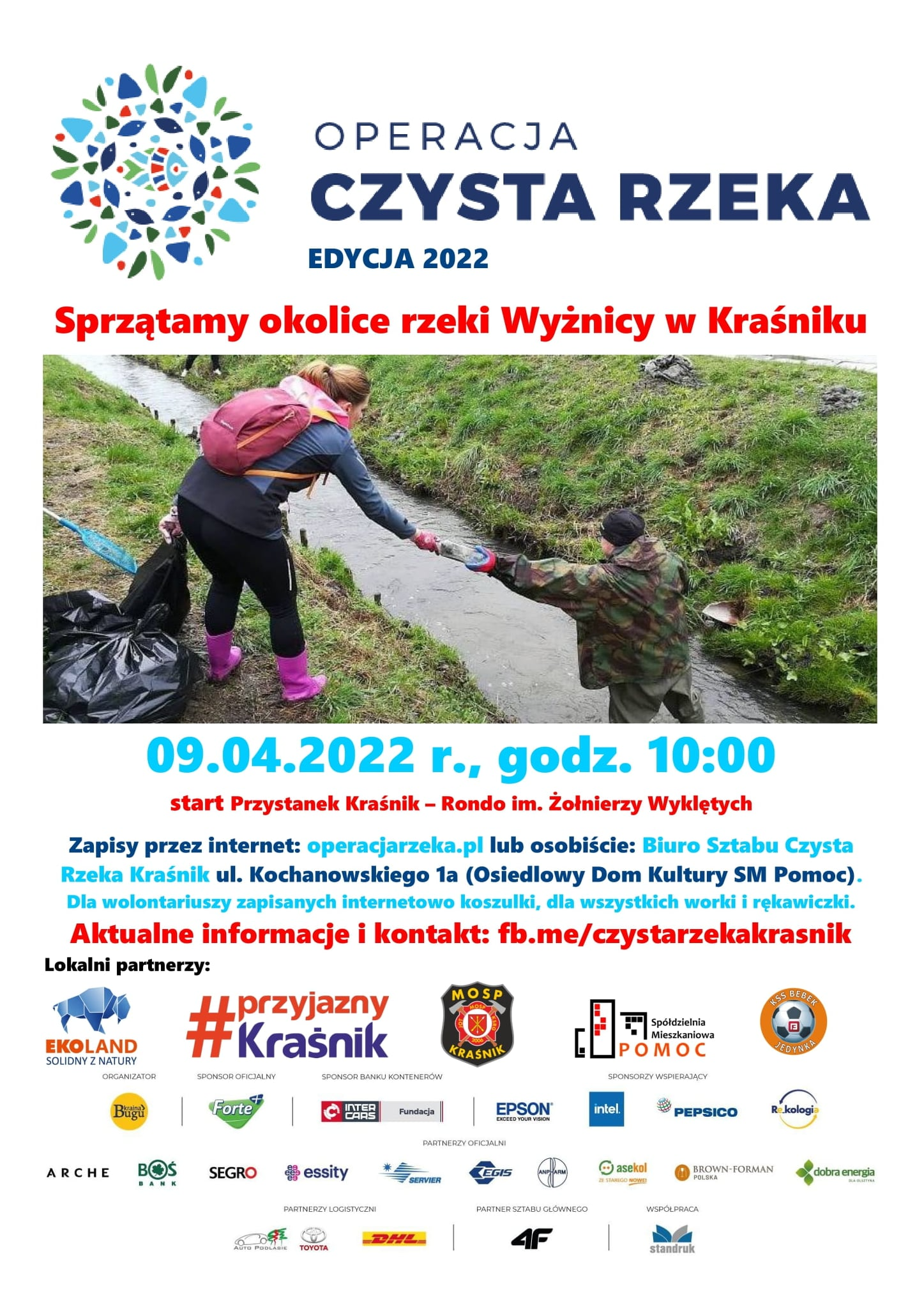 Do udziału w akcji rejestrować się można za pośrednictwem strony www.operacjarzeka.pl (tylko do najbliższej soboty, należy tam wyszukać akcję organizowaną w Kraśniku) lub do czasu akcji w biurze Sztabu Akcji Czysta Rzeka Kraśnik (Osiedlowy Dom Kultury SM „Pomoc”, ul. Kochanowskiego 1a, Kraśnik).